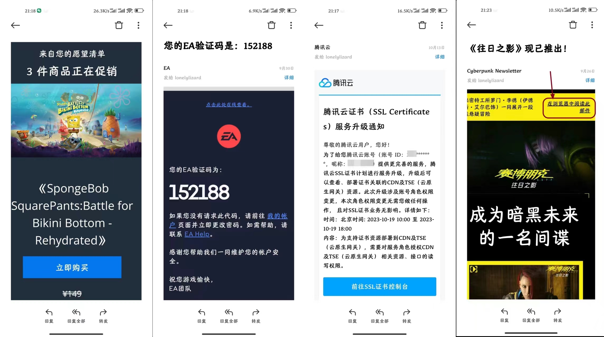 先来看一个实例,开发人员开发好邮件模板后,一个模板在4个邮箱上出现的问题各异