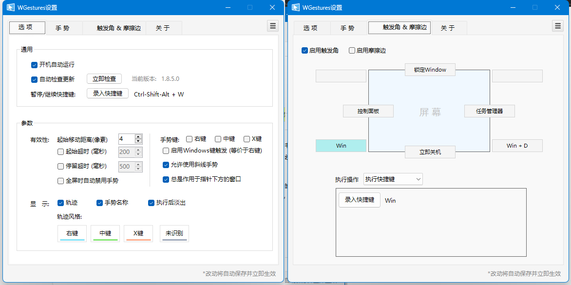 WGestures也是我从大学就开始用的软件,这个触发角很有创意也很实用,当你鼠标移动到左下角的时候,99.99%都是要打开开始菜单,移到右下角的时候同样八九不离十是要返回查看桌面,而WGestures可以在鼠标移动到位的时候直接触发打开菜单、返回首页。